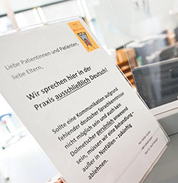 «В праксисе мы говорим исключительно по-немецки! Если общение из-за незнания немецкого языка невозможно и переводчик не будет присутствовать лично, мы вынуждены в дальнейшем, за исключением экстренных случаев, в лечении отказать».