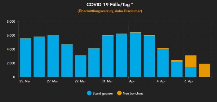 Может пройти несколько дней между отчётом врачей и лабораторий органу здравоохранения и передачей случаев в ответственные государственные органы и RKI. Каждый день в RKI поступают сообщения о новых случаях, о которых сообщалось в отдел здравоохранения в тот же день или ранее. Эти случаи затем добавляются к соответствующей дате в графике New COVID 19 case / day (оранжевая часть столбиков на диаграмме).