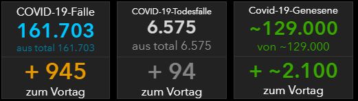 С того дня, когда институт Роберта Коха стал публиковать данные о продвижении пандемии, количество вновь инфицированных за день впервые выражается трёх-, а не четырёхзначным числом. С одной стороны, это несколько успокаивает после вчерашнего неожиданного «подскока», с другой – понятно, что вызвано эффектом выходного дня.
