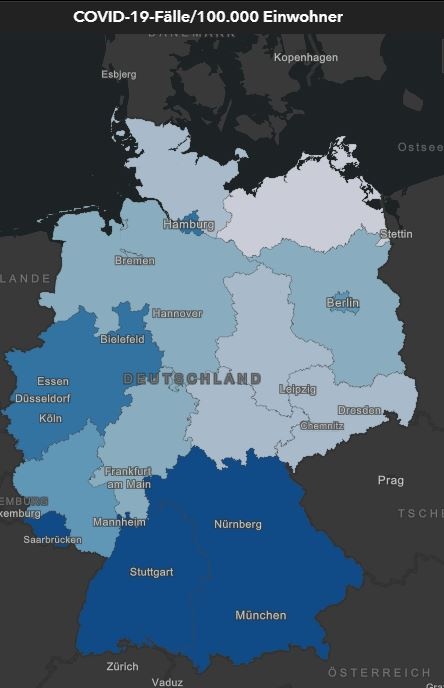 Здесь карта Германии, на которой плотность голубого соответствует плотности инфицирования, т.е. количеству инфицированных на 100 000 населения
