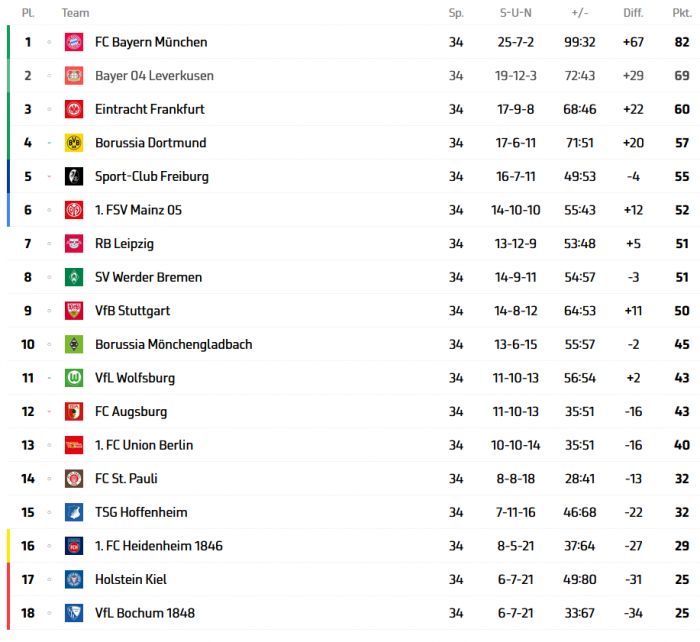 Главной интригой последнего тура была борьба за две путёвки в Лигу чемпионов, которую вели три команды – «Айнтрахт», «Фрайбург» и дортмундская «Боруссия». За бортом «королевского класса» остался «Фрайбург», которому в качестве утешения предстоит играть в Лиге Европы. А в Лигу конференций Германия делегирует «Майнц», который заслужил это право в матче с вице-чемпионом, хотя судья отменил четыре (!) гола «карнавальников», прибегая к помощи VAR.