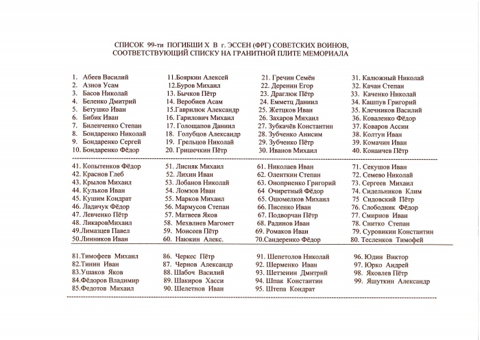 Нами с самого начала предпринимались попытки установить имена погибших советских солдат. Делу помог случай. Из Интернета о нас узнала Елена Лоцманова, помощник депутата Московской областной думы Михаила Леонтьева. Благодаря её обращению к властям Эссена, посольству РФ в Берлине, консульству РФ в Бонне были подняты эссенские городские архивы, откуда были извлечены и переведены на русский язык материалы, связанные с трагическими событиями декабря 1944 года. Так, благодаря настойчивости Елены и традиционной немецкой пунктуальности все 99 советских воинов перестали быть пропавшими без вести.