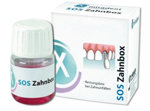 Поместить зуб в специальную емкость (Zahnrettungsbox). Теперь позаботьтесь о том, чтобы чувствительные корни зуба не высохли (а высыхают они, и безвозвратно, в течение нескольких минут). Поэтому, если есть возможность, лучше сразу же поместить зуб в Zahnrettungsbox. Обычно они имеются в школах, спортивных клубах и во всех аптеках. Такой бокс рекомендуется брать с собой в дорогу, если вы направляетесь куда-либо на отдых, особенно с детьми, или планируете заняться спортом. Как рекомендует Федеральное объединение зубных врачей, Zahnrettungsbox должен входить в любую аптечку неотложной помощи. В нем зуб можно сохранить в течение 24-48 часов.