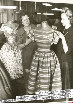 В 1947 году под девизом: «Из старого сделай новое», – проходит модное дефиле Франкфуртской гильдии портных. Как писали тогдашние газеты: «Остатки тканей, старые портьеры, диванные покрывала праздновали свое возрождение в виде дневных и вечерних туалетов». Участвовала в этом дефиле и модель Тони Шиссер, сшитая из довоенного золотистого бархата. Конечно, это был лишь рекламный ход, заявка на будущее. Попытка показать, что несмотря на все трудности марка «Тони Шиссер» еще существует.