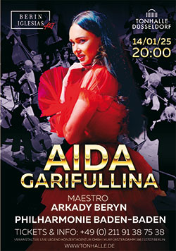 14 января 2025 года состоится единственный в Германии концерт знаменитой оперной дивы Аиды Гарифуллиной в легендарном Tonhalle Düsseldorf. На концерте, посвященном юбилею выдающегося дирижера современности Аркадия Берина, звезда мировой оперы исполнит популярные арии из опер и произведения Верди, Пуччини, Бизе, Шарпантье, Куртиса в сопровождении Баден-Баденского филармонического оркестра под управлением маэстро Берина. Также прозвучат известные произведения классической симфонической музыки Чайковского, Бетховена, Брамса, Верди, Пуччини.