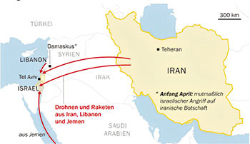 Весь мир напряженно ожидал этой ответной иранской реакции, и она последовала через две недели, 13-го апреля. Иран мог бы натравить на Израиль Хезболлу, что принесло бы еврейскому государству страшный урон, но... время еще, видимо, не настало. У всех на виду Израиль добивает Хамас в ответ на террористическое нападение, Хезболла не стремится повторить опыт Хамаса. Ирану пришлось на сей раз действовать своими руками. Расстояние между странами более тысячи километров, между ними Ирак, Сирия, Ливан, Иордания, удар мог быть нанесен только по воздуху. Перед этим Иран грозно предупредил арабов, чтобы они не вмешивались и не помогали Израилю.