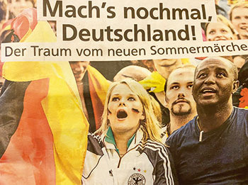 Помню, когда в Германии чемпионат мира проходил, даже у моей маленькой дочки над кроваткой висел флаг ее новой родины. Реально можно было утверждать, что команда под руководством Юргена Клинсмана активно участвует в патриотическом воспитании молодежи. И на доске в их немецком 5В после триумфальной победы сборной Германии над Эквадором мальчишки крупными буквами написали: «Мирослав Клозе!!!». (Два мяча все-таки парень забил!) И стирать с доски эти святые буквы маленькие футбольные фаны никому не давали. И у себя на ладошках фломастерами рисовали флаг Германии. И тоже – не отмыть было. И даже девчонки вели специальные дневники, где записывали результаты всех матчей, а Германию, конечно, ярко-красным обводили. И это при том, что треть класса – дети иностранцев.