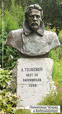 В июне 1904 года тяжело больной Чехов с женой приехал в Баденвайлер. О его последних минутах рассказала Ольга Леонардовна: «В начале ночи он проснулся и первый раз в жизни сам попросил послать за доктором. После он велел дать шампанского. Антон Павлович сел и как-то значительно, громко сказал доктору по-немецки: «Ichsterbe». Потом взял бокал, повернул ко мне лицо, улыбнулся своей удивительной улыбкой, сказал: «Давно я не пил шампанского…», спокойно выпил всё до дна, тихо лёг на левый бок и вскоре умолкнул навсегда».