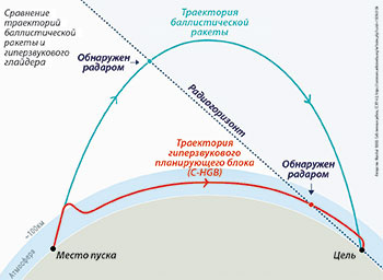 Российский глайдер, планирующий блок, называется «Авангард», он принят на вооружение в 2019 году. Такой блок, несущий ядерный заряд, устанавливается на старинной МБР УР-100Н вместо шести ядерных боеголовок. Всего их сделано 6 штук, они находятся в шахтах в Оренбургской области. «Авангард» большую часть траектории проходит в верхних слоях атмосфера и может совершать противоракетные маневры по высоте и направлению. При этом его поверхность нагревается за счет сопротивления воздуха до 1.600-2.000 градусов. В полете он выглядит, как огненный шар, что делает его хорошо видимым в инфракрасном спектре. Таким образом, даже будучи слабо различимым наземными радарами из-за низкой траектории, он может уверенно отслеживаться спутниками оптической разведки.