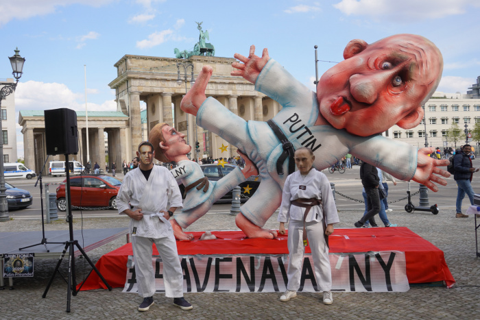 Жак Тилли, известный̆ скульптор карнавальных постановок, уже откликнулся на арест Навального, создав сатирическую композицию, где Алексей наносит Путину удар между ног. В тот год из-за пандемии карнавальное шествие на Rosenmontag было отменено, и скульптура «Удар по яйцам», как и другие фигуры, была представлена только на пресс-конференции, так что широкая публика видела ее лишь мельком. Тогда мы договорились с Жаком, что сможем использовать её на одном из наших больших мероприятий в Дюссельдорфе.