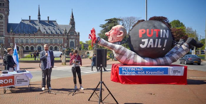 7 мая, в день инаугурации Путина, мы отвезли эту фигуру в Гаагу и установили перед Дворцом правосудия. Это стало мощным символом для миллионов людей. Акция вышла на международный уровень: к нам присоединились активисты из Мюнхена, Варшавы, Берлина, Парижа и других городов. BBC, Reuters, Al Jazeera – нас показали все мировые СМИ.