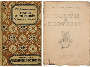 Однако самой первой книгой, попавшей под цензурный запрет в Советской России, была не эта, а другая книга, но тоже авторства Ю.И. Айхенвальда! Это увидевший свет в начале 1918 года в Москве 120-страничный сборник статей «Наша революция, её вожди и ведомые». Написаны (и опубликованы в газетах) эти статьи были в наиважнейшее время в российской истории – с февраля по октябрь 1917 года. «Все мы стали более жестоки, чем были раньше, война огрубила наши души, – говорилось здесь. – Современные ужасы поражают лишь тех, кого они непосредственно касаются. Все же остальные, только узнающие о насилиях и убийствах, не испытывают уже почти никакого впечатления. Притупилась впечатлительность, ко всему привыкли. ... Ничто больше не потрясает, не выводит нашего сердца из состояния моральной усталости». Один из основных результатов революции автор видит в гибели человеческой морали, в растлении народа, когда были разбужены «дремавшие в нем тёмные силы». О большевизме говорит как о «мутном источнике», большевиков называет «актёрами дьявольского спектакля», а то, что они творят, «граничит с преступлением». Издание такой книги вполне могло бы стоить свободы или даже жизни автору. Лишь чудом можно объяснить, что его не тронули до 1922 года. С большим трагизмом писать о русской революции и её катастрофических результатах Ю.И. Айхенвальд продолжал уже в изгнании.