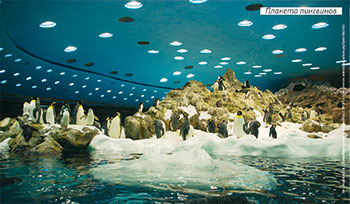 Вся эта компания родом из Антарктиды любит полярный холод и ледянyю воду. На Planet Penguin, самом большом в мире искусственном айсберге, окруженном водой c температурой от одного до трех градусов по Цельсию, снег производят ледогенераторы, расположенные под крышей пингвинария. А смотрители разбрасывают его по скалистому ландшафту.