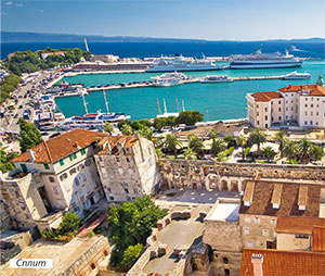 Попав в Сплит через Железные ворота, по узенькой улице Pusti me da prođem («пропусти меня»), прошли к императорскому дворцу (IV в.) – с колоннами, арками, башнями, залами, купольным вестибюлем, подвалами, фонтанами, мозаиками и 3.000-летним египетским сфинксом, прибывшим сюда при Диоклетиане. Уцелел языческий храм Юпитера (позже – баптистерий). Мавзолей императора (саркофаг утрачен) в средние века перестроили в Собор Святого Дуэ, украшенный мраморными колоннами, резьбой, фресками, алтарём работы средневекового архитектора и градостроителя Юрая Далматинца (он же – Джорджо Орсини), сокровищницей и прекрасной колокольней.