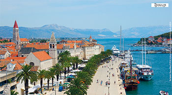 Другой остров занял упомянутый Птолемеем и Страбоном Трогир (Трагурион, III в. до н. э) – древний торговый порт с амбаром, теплицей, курортом для ветеранов. Слава и богатство пришли сюда в средневековье и ренессанс вместе с венецианской архитектурой, епископством и бойкой торговлей. За Северными воротами (XVII-XVIII вв.) с венецианским львом и статуей святого Ивана Орсини тянулись церкви, монастырские и дворцовые здания, колокольни – готические, ренессансные, барочные. Площадь Иоанна Павла II поразила кафедральным собором Святого Лаврентия и колокольней (XIII-XIV вв.): окно-роза, резной портал (библейские сюжеты, уличные сценки, календарь урожая), подпись мастера Радована: «Лучший в своём деле», романские нефы, деревянные хоры (Николы Флорентинца, ученика Донателло), часовня Иоанна Трогирского (XV в.).